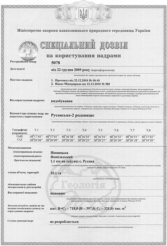 Дозвіл на використання надр родовища "Русавське-2" стор.1